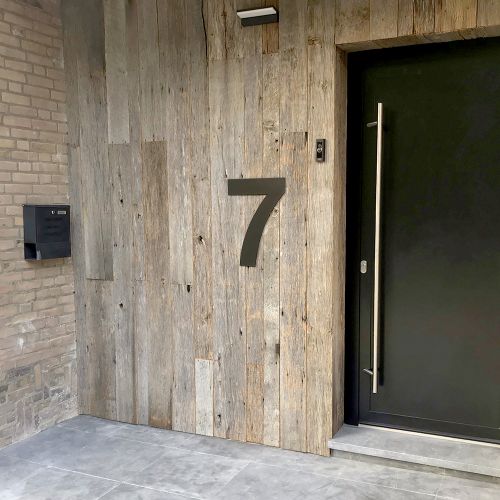 Grote huisnummers zwart 50 cm. Een groot huisnummer is enorm populair en is een echte eyecatcher op jouw woning. Deze modern vormgegeven huisnummers zijn vervaardigd van RVS304 met een mat zwarte fijnstructuur coating (RAL 9005) en zijn voorzien van afstandsbussen voor een blinde montage tegen de muur. Hiervoor dienen er 2 gaten met een diameter van 6 mm in de muur geboord te worden. Dit zwarte huisnummer wordt geleverd inclusief bevestigingsmaterialen en is geschikt voor montage op stenen en houten muren.