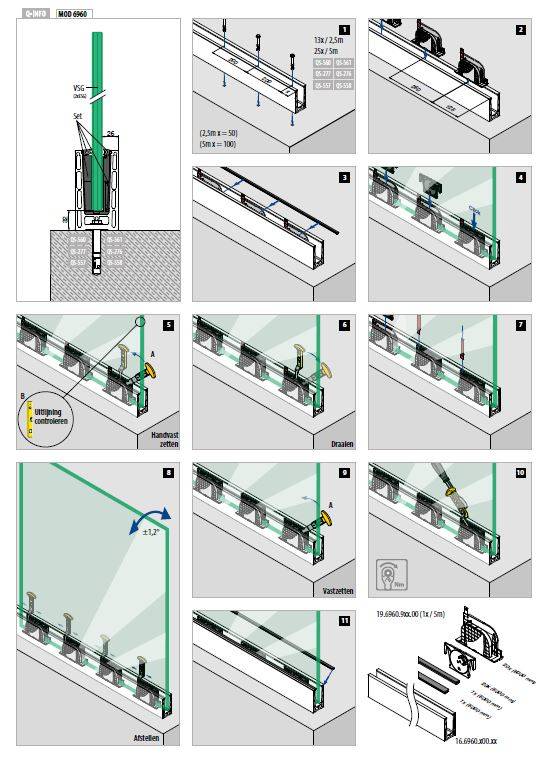 Glasrubberset MOD 8201 met rubbers en Q-discs voor het monteren van glasplaten in de vloerprofielen van het Easy Glass Smart glasbalustradesysteem. Het monteren van een glasrailing gaat hiermee eenvoudig en snel. Het voordeel van dit systeem is dat het glas vast wordt geklemd in de vloerprofielen, waardoor boren niet nodig is. Met deze rubberset kun je de glasplaten na montage nog 0,6 graden naar links of rechts t.o.v. de loodlijn verstellen. De set bestaat uit een rubber voor de achterzijde van de glasplaat, een rubber voor de voorzijde van de glasplaat, inlegkeggen en Q-discs. De set is bruikbaar voor zowel het Easy Glass Smart Topmontage als Zijmontage systeem. Deze set is leverbaar voor een lengte van 2,5, 5 en 25 meter en voor glasdiktes tussen 12 en 17,52 mm. Voor het monteren van deze rubberset heb je het Q-disc en inlay tool en een momentsleutel nodig.