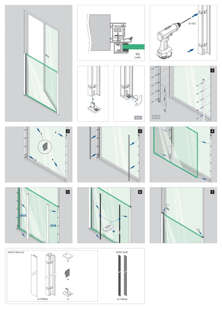 Voor montage op de gevel of in de dag dienen er gaten met een diameter van 10,5 mm in de profielen geboord te worden. Boor gaten in de muur op minstens 60 mm afstand van de dag, en met een h.o.h. afstand van 200 mm. De profielen worden vervolgens op de muur vast gezet met 12 houtschroeven met schotelkop (6 stuks in elk profiel). In de binnenzijde van de profielen worden de montagegaten afgedekt met de afdekdoppen. Tenslotte worden de glasrubbers en het glas in de profielen geklemd. Het glas wordt gemakkelijk en snel met een slim kliksysteem in de profielen gemonteerd en afgewerkt met glasrubbers. De eindkappen worden met een inbussleutel op de profielen gemonteerd.