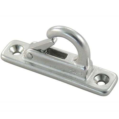Fenderhaak met snapsluiting op een smalle montageplaat van 70 x 17 mm, vervaardigd van RVS316 met een glanzend oppervlak. De haak is geschikt voor montage tegen een vlakke ondergrond en is voorzien van 2 verzonken montagegaten met een diameter van 4,4 mm. Fenderhaken worden onder andere toegepast in de zeilsport, dus op boten en jachten, maar je kunt ze ook gebruiken voor allerlei huis- en tuindoeleinden.