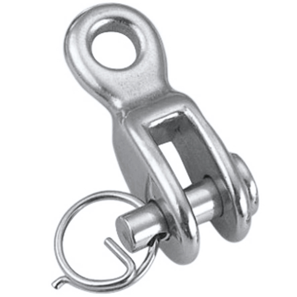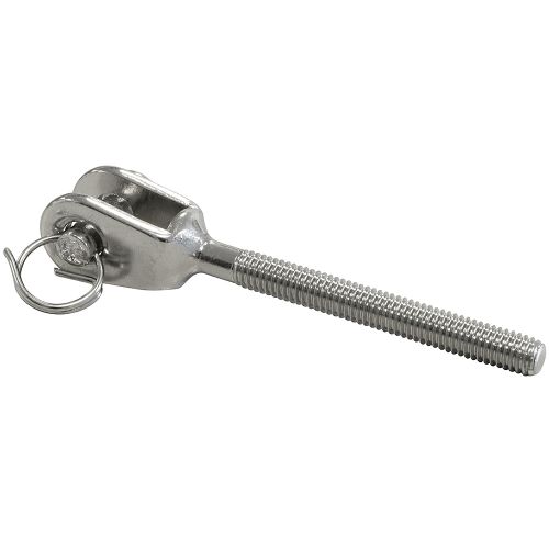 RVS gaffel met uitwendige draad M6 met een totale lengte van 80 mm. De lengte tot het hart van de as is 71 mm. De gaffel is voorzien van een uitneembare as van 5,8 mm. Gemaakt van RVS316 met een glanzend oppervlak.