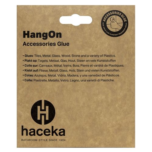 HangOn is een universele lijm voor het monteren van Haceka badkameraccesoires. Zo kun je je accessoires heel eenvoudig op de muur van je badkamer of toilet bevestigen zonder te hoeven boren. De lijm is bruikbaar op bijna iedere (vetvrije) ondergrond, zoals tegels, metaal, glas, hout en steen. HangOn is geschikt voor vochtige ruimtes, maar kan niet onder water worden gebruikt. In de verpakking zit één sachet, hiermee kun je ongeveer 4 rozetten bevestigen. De draagkracht per rozet is ca. 20 kg. Dit is afhankelijk van de dikte van de lijmlaag die je gebruikt en hoe goed de lijm is uitgehard voordat het badkameraccessoire wordt belast. Deze lijm is gemakkelijk te verwijderen met een plamuurmesje en laat geen restjes achter.