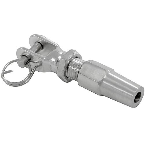 RVS staalkabel eindstuk voor staaldraad diameter van 4,0 mm. Het eindstuk is vervaardigd uit RVS316 en voorzien van een mat geborsteld oppervlak. De staalkabel wordt vastgezet in een conisch gevormde spankop, hierdoor zal de kabel bij het op spanning trekken van de staaldraad spanner strakker in de kop getrokken worden. De staaldraad terminal wordt met een gaffel vastgezet in een oogbout, deze wordt niet meegeleverd en dient los meebesteld te worden.