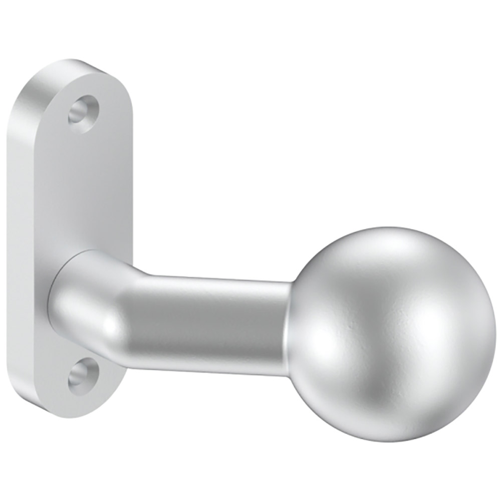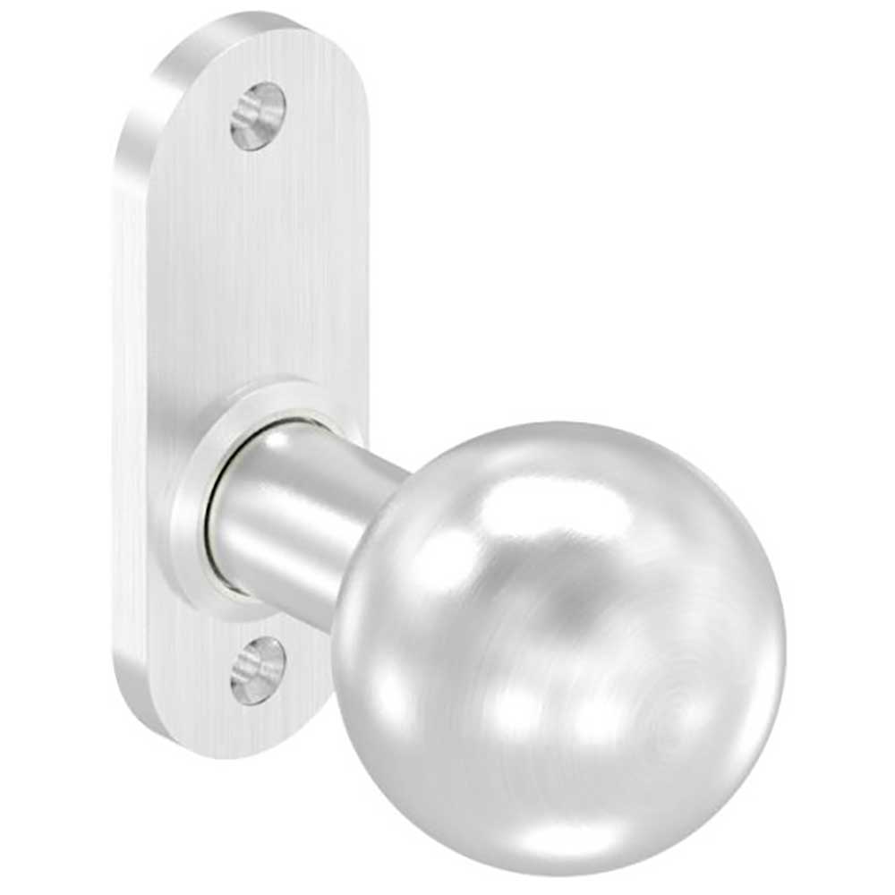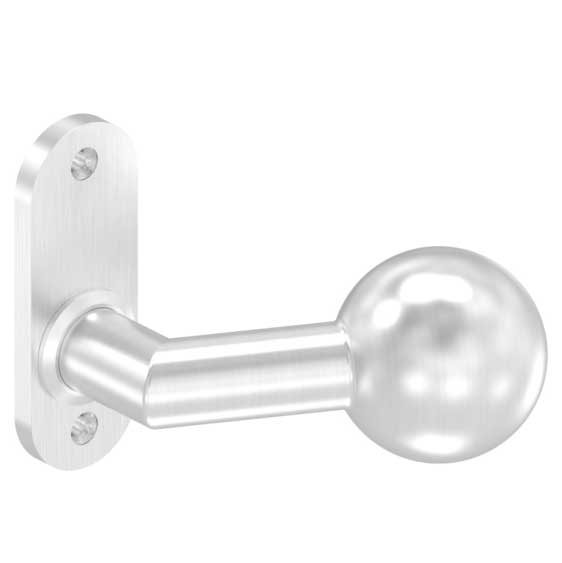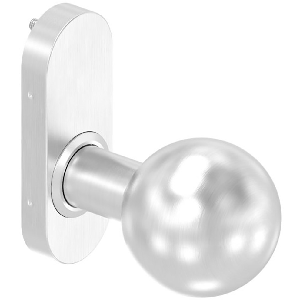 RVS deurknop bol op ovaal kortschild, vervaardigd van RVS304 met een mat geborsteld oppervlak. Deze deurknop met een diameter van 50 mm is vast, dus niet draaibaar, en is geschikt voor slotkasten en poorten. De knop kan worden omgedraaid zodat deze te gebruiken is voor zowel links- als rechtsdraaiende deuren of poorten. De knop wordt geleverd per stuk en is dus geschikt voor montage aan één zijde van de poort. De hart op hart afstand van de montagegaten is 67 mm, hiervoor worden 2 RVS schroefjes M4 x 18 mm meegeleverd. Exclusief deurkrukstift.