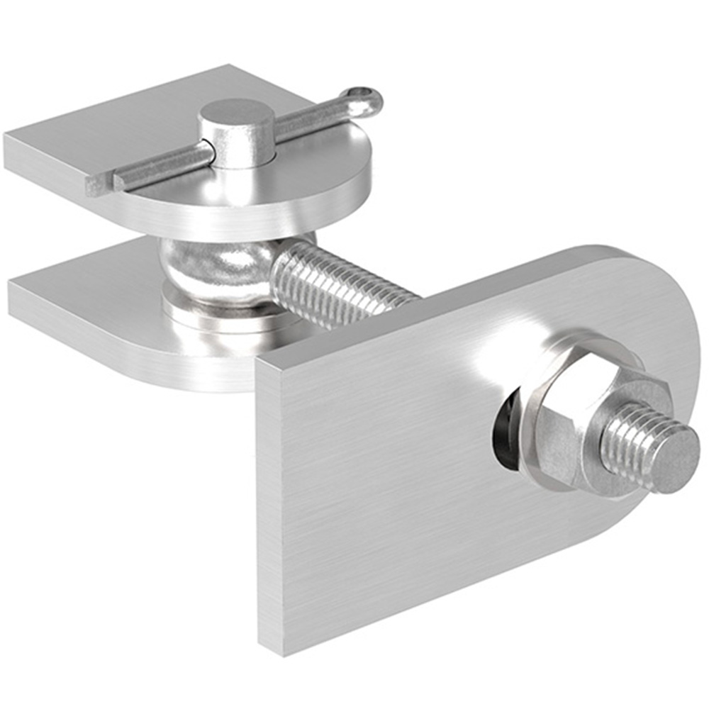 Stalen poortscharnier. De oogbout en moeren zijn verzinkt. Dit scharnier wordt middels een lasverbinding gemonteerd. De lasdelen zijn onbewerkt en lasbaar. Het poortscharnier is voorzien van 2 stuks messing schijven en is 180 graden verstelbaar.