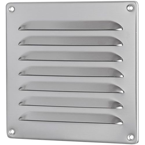 RVS vierkant schoepenrooster van 195 x 195 mm, vervaardigd van RVS304 met een mat geborsteld oppervlak. Dit ventilatierooster is voorzien van een verticale rij lamellen en een omgezette rand. Het rooster is geschikt voor toevoer en afvoer van lucht in combinatie met natuurlijke ventilatie en dus ongeschikt voor mechanische ventilatie, afzuigkappen en wasdrogers. In de hoeken zitten verzonken gaatjes met een diameter van 4 mm, waardoor je het rooster met schroeven kunt vastzetten, deze worden niet meegeleverd.